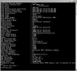 On distingue parfaitement bien les données sur la capture d’écran ci-dessous, le téléphone est un Iphone avec un appareil photo Motorola, la photo est prise à l’horizontale. On distingue sur la fin les coordonnées GPS de la photo. Un simple recoupement de toutes ces informations fournissent déjà beaucoup de détails…